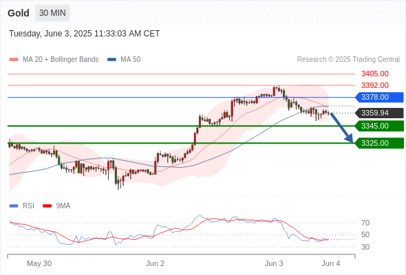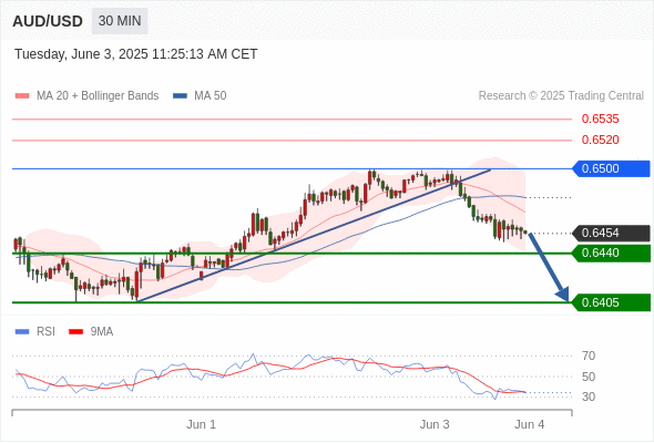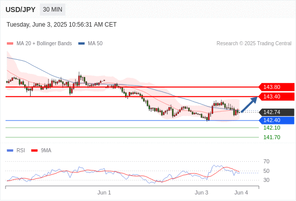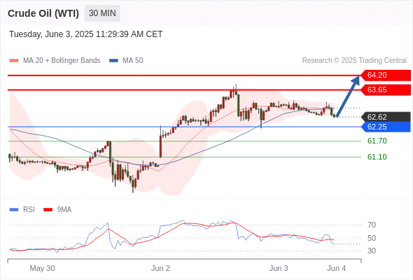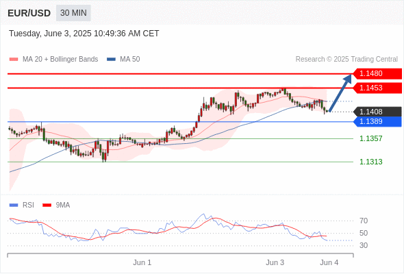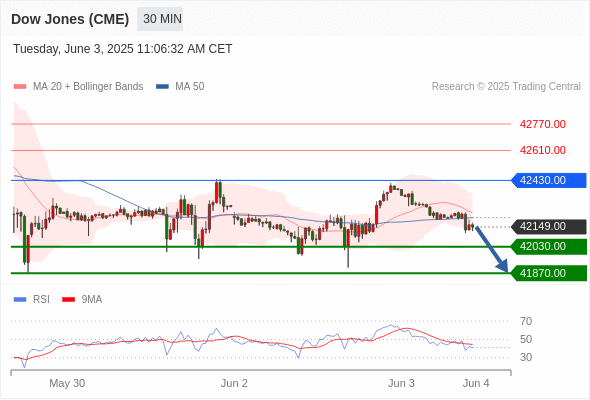 交易分析-6月3日(美盘前) 温馨提示:由于市场波动,价格可能已经越过关键点位,令策略失效。 欧元/美元 当日内: 短期调整。 转折点: 1.1389 交易策略: 在 1.1389 之上,看涨,目标价位为 1.1453 ,然后为 1.1480 。 备选策略: 在 1.1389 下,看空,目标价位定在 1.1357 ,然后为 1.1313。 技术点评: 在1.1389之上,为多头信号,向上的目标位为1.1453。 美国原油 (WTI) 期货 (N5) 当日内: 超短线(当日内)支撑位在62.25附近。 转折点: 62.25 交易策略: 在 62.25 之上,看涨,目标价位为 63.65 ,然后为 64.20 。 备选策略: 在 62.25 下,看空,目标价位定在 61.70 ,然后为 61.10。 技术点评: 即使我们不能排除持续调整的可能性,其时间长度上,应该是有限的。 黄金现货 当日内: 调整。 转折点: 3378.00 交易策略: 在 3378.00 之下,看跌,目标价位为 3345.00 ,然后为 3325.00 。 备选策略: 在 3378.00 上,看涨,目标价位定在 3392.00 ,然后为 3405.00。 技术点评: 只要3378.00阻力位不被突破,向下跌破3345.00位置的风险很高。 英镑/美元 当日内: 预期上涨。 转折点: 1.3499 交易策略: 在 1.3499 之上,看涨,目标价位为 1.3558 ,然后为 1.3586 。 备选策略: 在 1.3499 下,看空,目标价位定在 1.3470 ,然后为 1.3444。 技术点评: 即使我们不能排除持续调整的可能性,其时间长度上,应该是有限的。 美元/日元 当日内: 看涨。 转折点: 142.40 交易策略: 在 142.40 之上,看涨,目标价位为 143.40 ,然后为 143.80 。 备选策略: 在 142.40 下,看空,目标价位定在 142.10 ,然后为 141.70。 技术点评: 142.40附近形成了一个支撑的底部,将带来走势短期内的稳定。 美元/加元 当日内: 被上升趋势线支撑。 转折点: 1.3695 交易策略: 在 1.3695 之上,看涨,目标价位为 1.3760 ,然后为 1.3780 。 备选策略: 在 1.3695 下,看空,目标价位定在 1.3670 ,然后为 1.3650。 技术点评: 1.3695附近形成了一个支撑的底部,将带来走势短期内的稳定。 澳元/美元 当日内: 存在压力。 转折点: 0.6500 交易策略: 在 0.6500 之下,看跌,目标价位为 0.6440 ,然后为 0.6405 。 备选策略: 在 0.6500 上,看涨,目标价位定在 0.6520 ,然后为 0.6535。 技术点评: 其即时趋势维持向下,但缺乏动能。 美国道琼斯指数期货 (M5) 当日内: 箱体震荡。 转折点: 42430.00 交易策略: 在 42430.00 之下,看跌,目标价位为 42030.00 ,然后为 41870.00 。 备选策略: 在 42430.00 上,看涨,目标价位定在 42610.00 ,然后为 42770.00。 技术点评: RSI技术指标缺乏动能 苹果 当日内 : 看涨,当 199.19 为支撑位。 转折点为: 199.19 交易策略: : 替代方案: 在199.19以下,期待196.51和194.91。 技术点评: RSI技术指标大于中性区域50。 MACD技术指标处在其信号线之上看多。 配置为正。 此外,价位高于其20天及50天移动平均线 ( 分别位于200.37 和200.19 )。 Admin|0 条评论 Share This Story, Choose Your Platform! FacebookXRedditLinkedInTumblrPinterestVk电邮 相关文章