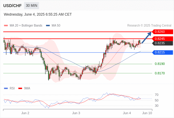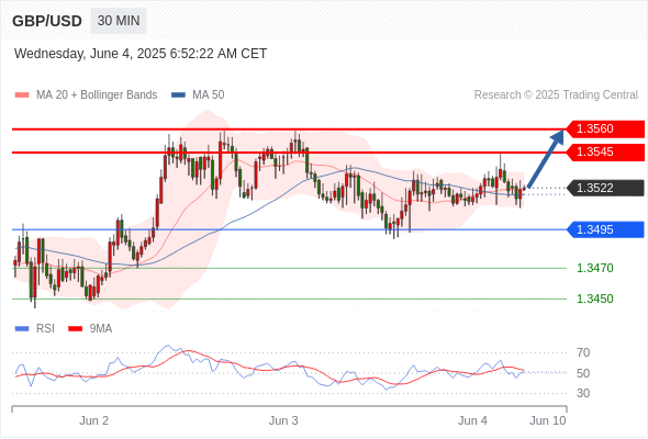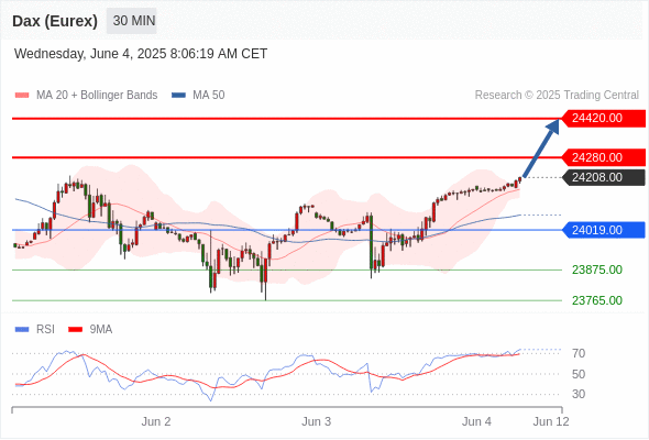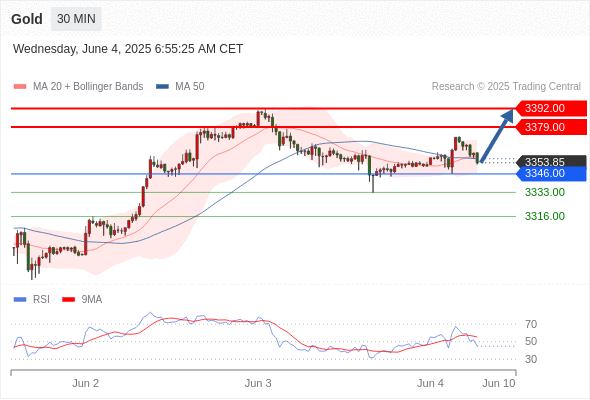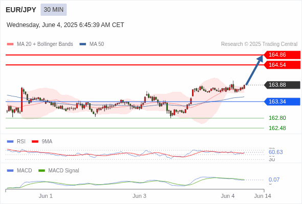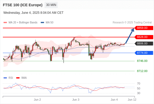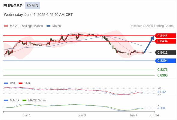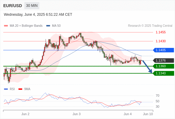 交易分析-6月4日(欧盘前) 温馨提示:由于市场波动,价格可能已经越过关键点位,令策略失效。 欧元/美元 当日内: 期待1.1360。 转折点: 1.1405 交易策略: 在 1.1405 之下,看跌,目标价位为 1.1360 ,然后为 1.1340 。 备选策略: 在 1.1405 上,看涨,目标价位定在 1.1430 ,然后为 1.1455。 技术点评: 跌破1.1360位置,将会引发下跌至1.1340。 黄金现货 当日内: 超短线(当日内)支撑位在3346.00附近。 转折点: 3346.00 交易策略: 在 3346.00 之上,看涨,目标价位为 3379.00 ,然后为 3392.00 。 备选策略: 在 3346.00 下,看空,目标价位定在 3333.00 ,然后为 3316.00。 技术点评: RSI技术指标运行趋势复杂。 英镑/美元 当日内: 在1.3495之上,看涨。 转折点: 1.3495 交易策略: 在 1.3495 之上,看涨,目标价位为 1.3545 ,然后为 1.3560 。 备选策略: 在 1.3495 下,看空,目标价位定在 1.3470 ,然后为 1.3450。 技术点评: 1.3495附近形成了一个支撑的底部,将带来走势短期内的稳定。 欧元/日元 当日内 : 看涨,当 163.34 为支撑位,目标定在164.86。 转折点为: 163.34 交易策略: : 替代方案: 在163.34以下,期待162.80和162.48。 技术点评: RSI技术指标大于中性区域50。 MACD技术指标处在其信号线之下看多。 价格可能会回撤。 此外,价位高于其20天及50天移动平均线 ( 分别位于163.76 和163.50 )。 最后,价位突破其布林线通道上轨 (位于163.88。 欧元/英镑 当日内 : 有上涨的可能,目标价位定在 0.8445 。 转折点为: 0.8394 交易策略: : 替代方案: 在0.8394以下,期待0.8376和0.8365。 技术点评: RSI技术指标小于中性区域50。 MACD技术指标处在其信号线之上看空。 混合配置。 另外,价位低于其50天移动平均线 (0.8424 ) 但高于其20天移动平均线 (0.8411 )。 美元/瑞郎 当日内: 上升趋势。 转折点: 0.8215 交易策略: 在 0.8215 之上,看涨,目标价位为 0.8245 ,然后为 0.8260 。 备选策略: 在 0.8215 下,看空,目标价位定在 0.8190 ,然后为 0.8170。 技术点评: 随后的阻力位是0.8245,然后为0.8260。 德国DAX指数期货 (Eurex) (M5) 当日内: 超短线(当日内)支撑位在24019.00附近。 转折点: 24019.00 交易策略: 在 24019.00 之上,看涨,目标价位为 24280.00 ,然后为 24420.00 。 备选策略: 在 24019.00 下,看空,目标价位定在 23875.00 ,然后为 23765.00。 技术点评: RSI技术指标运行趋势复杂,倾向于上升。 布伦特原油 (ICE) (Q5) 当日内: 看涨。 转折点: 64.95 交易策略: 在 64.95 之上,看涨,目标价位为 65.95 ,然后为 66.30 。 备选策略: 在 64.95 下,看空,目标价位定在 64.50 ,然后为 64.05。 技术点评: 即使我们不能排除持续调整的可能性,其时间长度上,应该是有限的。 英国富时100指数期货 当日内: 超短线(当日内)支撑位在8774.00附近。 转折点: 8774.00 交易策略: 在 8774.00 之上,看涨,目标价位为 8828.00 ,然后为 8859.00 。 备选策略: 在 8774.00 下,看空,目标价位定在 8746.00 ,然后为 8712.00。 技术点评: RSI技术指标运行趋势复杂,倾向于上升。 Admin|0 条评论 Share This Story, Choose Your Platform! FacebookXRedditLinkedInTumblrPinterestVk电邮 相关文章