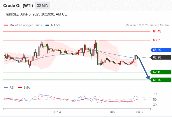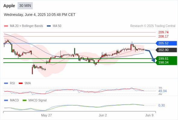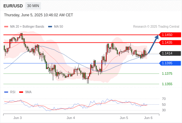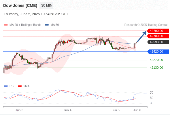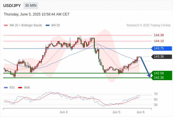 交易分析-6月5日(美盘前) 温馨提示:由于市场波动,价格可能已经越过关键点位,令策略失效。 欧元/美元 当日内: 短期调整。 转折点: 1.1395 交易策略: 在 1.1395 之上,看涨,目标价位为 1.1435 ,然后为 1.1450 。 备选策略: 在 1.1395 下,看空,目标价位定在 1.1375 ,然后为 1.1355。 技术点评: 超短线(当日内)技术指标运行趋势复杂。 美国原油 (WTI) 期货 (N5) 当日内: 短期关键阻力位在63.40。 转折点: 63.40 交易策略: 在 63.40 之下,看跌,目标价位为 62.15 ,然后为 61.70 。 备选策略: 在 63.40 上,看涨,目标价位定在 63.95 ,然后为 64.45。 技术点评: 只要63.40阻力位不被突破,向下跌破62.15位置的风险很高。 黄金现货 当日内: 在3363.00之上,看涨。 转折点: 3363.00 交易策略: 在 3363.00 之上,看涨,目标价位为 3392.00 ,然后为 3408.00 。 备选策略: 在 3363.00 下,看空,目标价位定在 3352.00 ,然后为 3343.00。 技术点评: 3363.00附近形成了一个支撑的底部,将带来走势短期内的稳定。 英镑/美元 当日内: 期待1.3579。 转折点: 1.3537 交易策略: 在 1.3537 之上,看涨,目标价位为 1.3579 ,然后为 1.3595 。 备选策略: 在 1.3537 下,看空,目标价位定在 1.3505 ,然后为 1.3490。 技术点评: 即使我们不能排除持续调整的可能性,其时间长度上,应该是有限的。 美元/日元 当日内: 下跌趋势。 转折点: 143.75 交易策略: 在 143.75 之下,看跌,目标价位为 142.58 ,然后为 142.36 。 备选策略: 在 143.75 上,看涨,目标价位定在 144.10 ,然后为 144.38。 技术点评: 指数在现阶段,面临143.75阻力区域的挑战。 美元/加元 当日内: 存在压力。 转折点: 1.3700 交易策略: 在 1.3700 之下,看跌,目标价位为 1.3650 ,然后为 1.3630 。 备选策略: 在 1.3700 上,看涨,目标价位定在 1.3725 ,然后为 1.3742。 技术点评: 只要依旧存在1.3700阻力位,价格波动存在看跌的趋势。 澳元/美元 当日内: 新一轮上升。 转折点: 0.6483 交易策略: 在 0.6483 之上,看涨,目标价位为 0.6509 ,然后为 0.6520 。 备选策略: 在 0.6483 下,看空,目标价位定在 0.6460 ,然后为 0.6445。 技术点评: 在0.6483之上,为多头信号,向上的目标位为0.6509。 美国道琼斯指数期货 (M5) 当日内: 在42420.00之上,看涨。 转折点: 42420.00 交易策略: 在 42420.00 之上,看涨,目标价位为 42700.00 ,然后为 42790.00 。 备选策略: 在 42420.00 下,看空,目标价位定在 42270.00 ,然后为 42130.00。 技术点评: RSI技术指标看涨,有进一步向上趋势。 苹果 当日内 : 逐渐下跌,当 205.52 阻碍上行,则 198.04 为目标位。 转折点为: 205.52 交易策略: : 替代方案: 在205.52以上,查找208.17和209.74。 技术点评: RSI技术指标小于中性区域50。 MACD技术指标处在其信号线之下看多。 MACD必须突破其零线,才能预期出现进一步下行。 另外,价位低于其20天移动平均线 (203.47 ) 但高于其50天移动平均线 (201.73 )。 Admin|0 条评论 Share This Story, Choose Your Platform! FacebookXRedditLinkedInTumblrPinterestVk电邮 相关文章