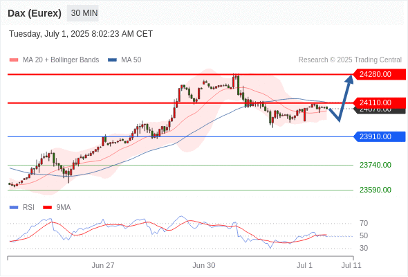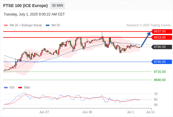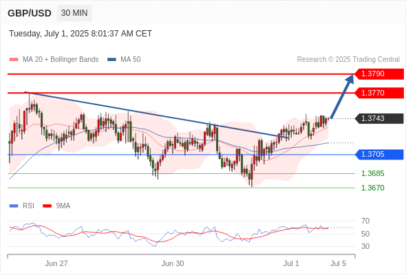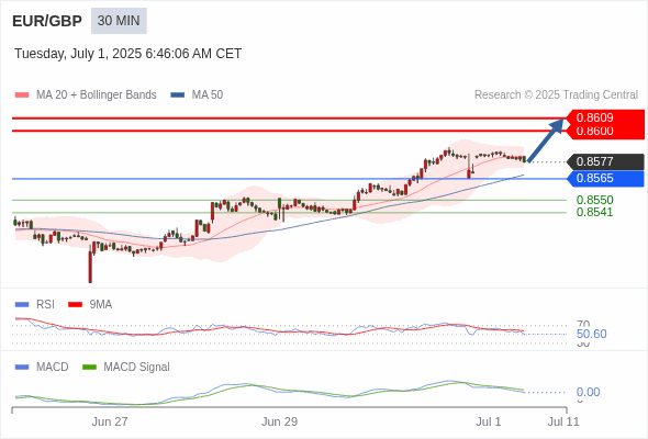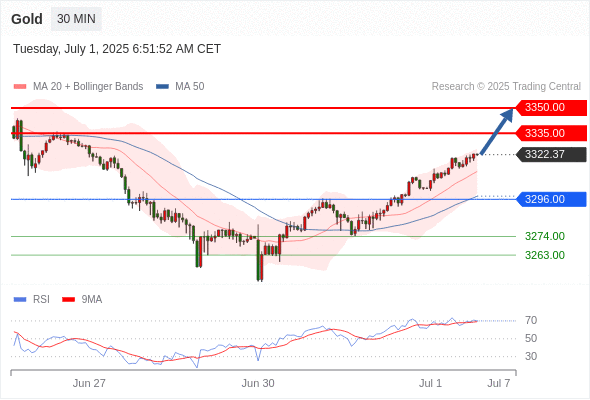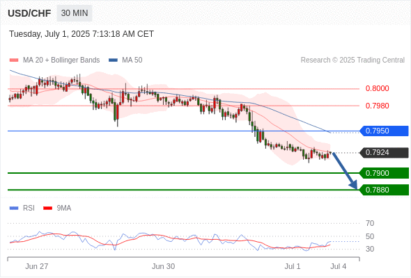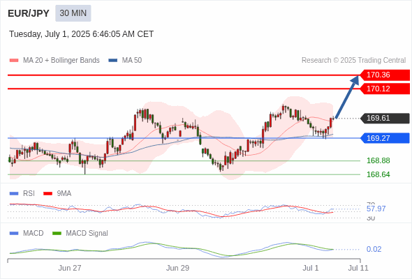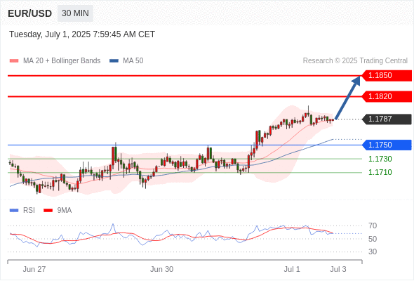 交易分析-7月1日(欧盘前) 温馨提示:由于市场波动,价格可能已经越过关键点位,令策略失效。 欧元/美元 当日内: 上升趋势。 转折点: 1.1750 交易策略: 在 1.1750 之上,看涨,目标价位为 1.1820 ,然后为 1.1850 。 备选策略: 在 1.1750 下,看空,目标价位定在 1.1730 ,然后为 1.1710。 技术点评: 在1.1750之上,为多头信号,向上的目标位为1.1820。 黄金现货 当日内: 目标位为3335.00。 转折点: 3296.00 交易策略: 在 3296.00 之上,看涨,目标价位为 3335.00 ,然后为 3350.00 。 备选策略: 在 3296.00 下,看空,目标价位定在 3274.00 ,然后为 3263.00。 技术点评: RSI技术指标向上运行。 英镑/美元 当日内: 进一步上涨。 转折点: 1.3705 交易策略: 在 1.3705 之上,看涨,目标价位为 1.3770 ,然后为 1.3790 。 备选策略: 在 1.3705 下,看空,目标价位定在 1.3685 ,然后为 1.3670。 技术点评: RSI技术指标缺乏下降动能 欧元/日元 当日内 : 看涨,当 169.27 为支撑位,目标定在170.36。 转折点为: 169.27 交易策略: : 替代方案: 在169.27以下,期待168.88和168.64。 技术点评: RSI技术指标大于中性区域50。 MACD技术指标处在其信号线之下看多。 价格可能会回撤。 此外,价位高于其20天及50天移动平均线 ( 分别位于169.56 和169.34 )。 欧元/英镑 当日内 : 看涨,当 0.8565 为支撑位,目标定在0.8609。 转折点为: 0.8565 交易策略: : 替代方案: 在0.8565以下,期待0.8550和0.8541。 技术点评: RSI技术指标大于中性区域50。 MACD技术指标处在其信号线之下看多。 价格可能会回撤。 另外,价位低于其20天移动平均线 (0.8580 ) 但高于其50天移动平均线 (0.8568 )。 美元/瑞郎 当日内: 朝0.7900运行。 转折点: 0.7950 交易策略: 在 0.7950 之下,看跌,目标价位为 0.7900 ,然后为 0.7880 。 备选策略: 在 0.7950 上,看涨,目标价位定在 0.7980 ,然后为 0.8000。 技术点评: 只要依旧存在0.7950阻力位,很可能下跌至0.7900。 德国DAX指数期货 (Eurex) (U5) 当日内: 短期调整。 转折点: 23910.00 交易策略: 在 23910.00 之上,看涨,目标价位为 24110.00 ,然后为 24280.00 。 备选策略: 在 23910.00 下,看空,目标价位定在 23740.00 ,然后为 23590.00。 技术点评: RSI技术指标运行趋势复杂,应谨慎操作。 布伦特原油 (ICE) (U5) 当日内: 存在压力。 转折点: 66.90 交易策略: 在 66.90 之下,看跌,目标价位为 66.25 ,然后为 65.90 。 备选策略: 在 66.90 上,看涨,目标价位定在 67.30 ,然后为 67.75。 技术点评: RSI技术指标看跌,有进一步下降空间。 英国富时100指数期货 (U5) 当日内: 短期调整。 转折点: 8745.00 交易策略: 在 8745.00 之上,看涨,目标价位为 8819.00 ,然后为 8837.00 。 备选策略: 在 8745.00 下,看空,目标价位定在 8715.00 ,然后为 8690.00。 技术点评: RSI技术指标缺乏动能 Admin|0 条评论 Share This Story, Choose Your Platform! FacebookXRedditLinkedInTumblrPinterestVk电邮 相关文章